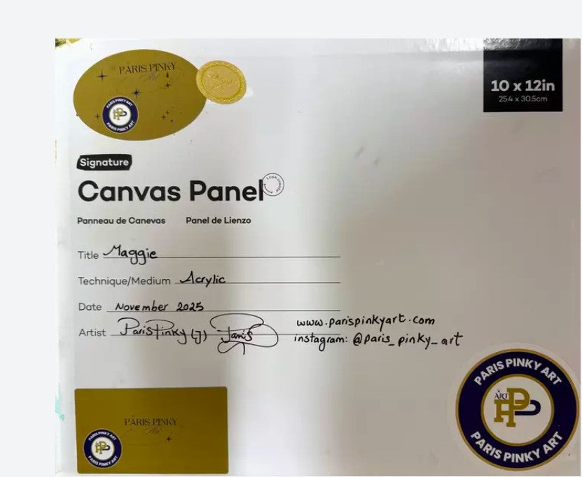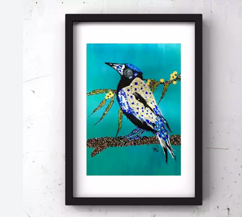 Maggie is an abstract Australian magpie, glowing with blue and gold in its feathers against a teal background and surrounded by golden wattle flowers, reflecting a quiet balance between nature and spirit.